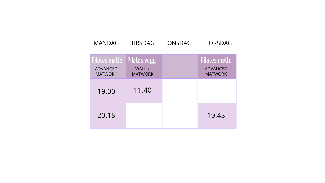 Advancedklassen er for deg som har trent Pilates en god stund. Her utfordres du på styrke, kontroll og utholdenhet.